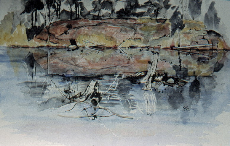 Foley Mountain Pond, 22 x 30 in, watercolour and ink
