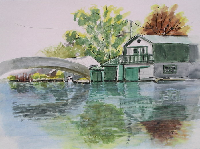 Westport Harbour Boat House, 22 x 30 in, watercolour and ink